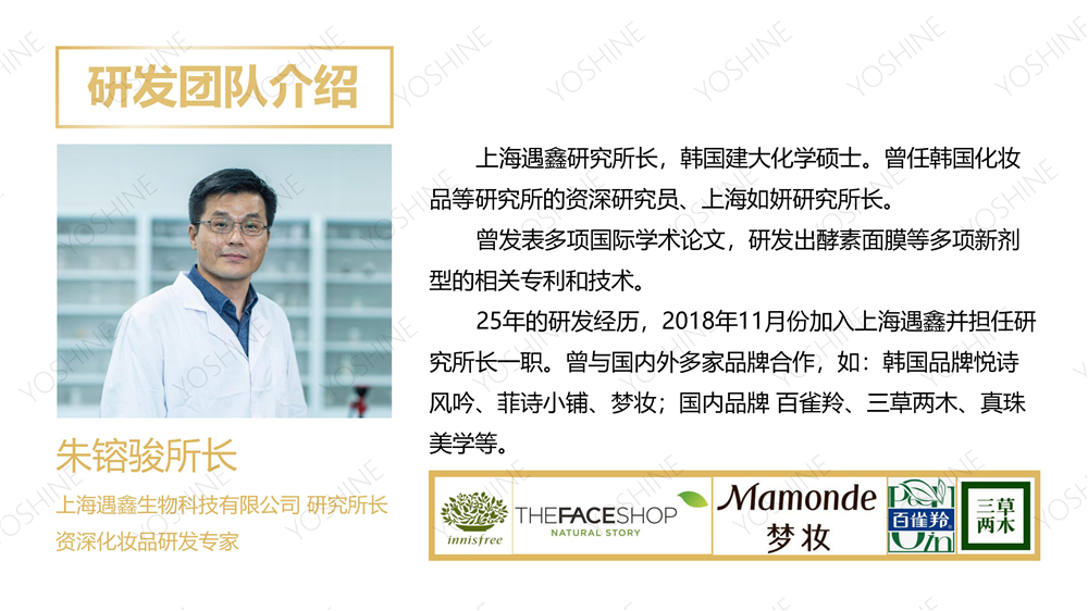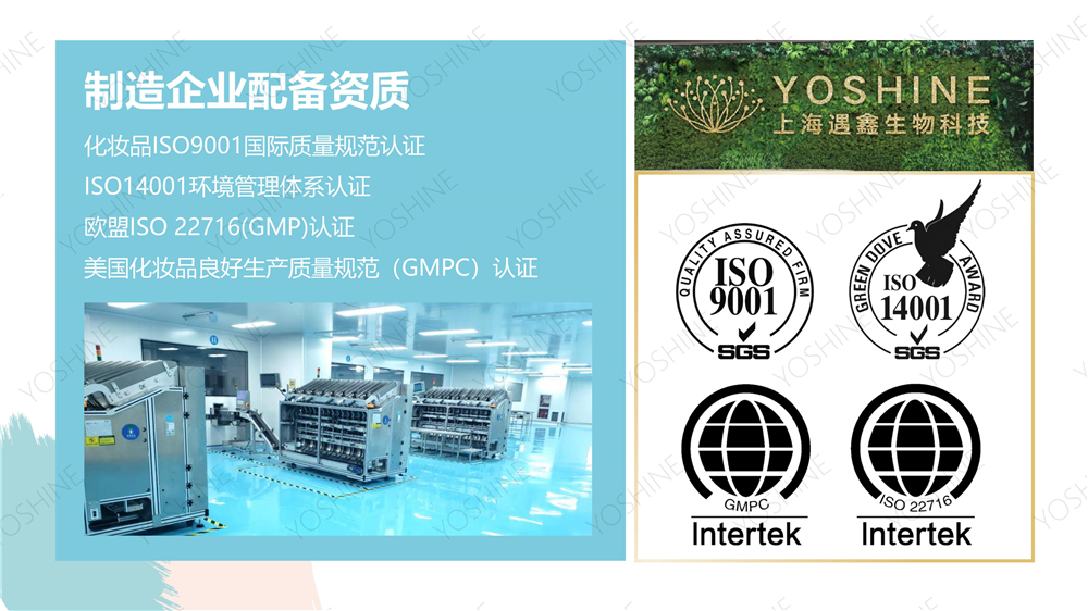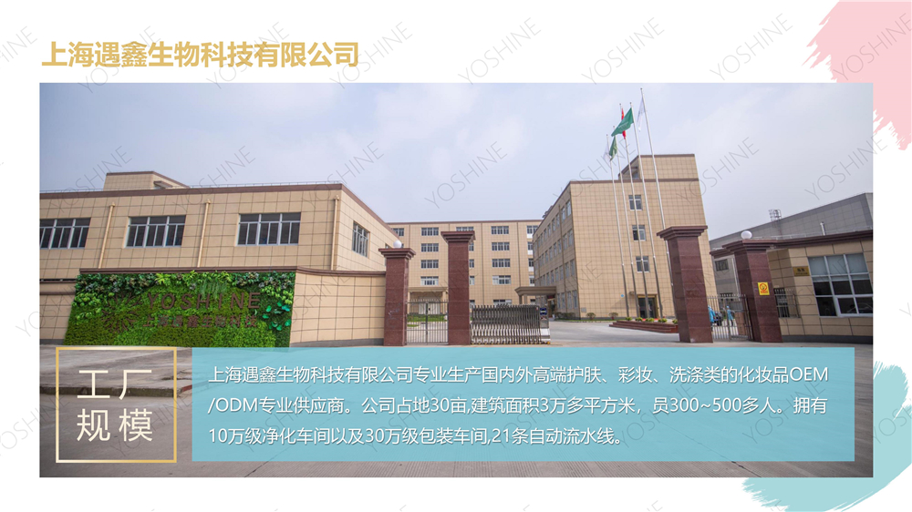 上海遇鑫生物科技有限公司是一家跨国际性专业化妆品代加工,化妆品OEM/化妆品ODM一站式服务集团化公司,是国内仅有的几家同时通过欧盟GMPC认证1万级标准化妆品生产车间,与珀莱雅、三草两木等知名品牌合作。